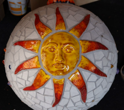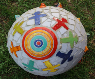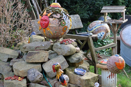 Aus vielen Elemente, die als Kugeln beginnen, entstehen durch ihre Inspiration lebendige Tierfiguren wie Hähne und Hühner, Hasen oder einfach phantasievolle Figuren, die gute Laune verbreiten und sich natürlich in die Umgebung eines Gartens einpassen. Wichtig ist ihr dabei die Farbe, die sich immer sehr leuchtend in gelb, rot, orange, ganz bunt hervorhebt. Beim Brennen im eigenen Ofen verschmelzen dabei manche Farben zu neuen Kreationen.