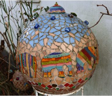 Während zahlreicher Urlaube in Spanien wurde sie von den Arbeiten von Antonio Gaudí inspiriert. Dies brachte sie dazu, mit geschnittenen und gebrochenen Fliesen und Keramikteilen zu experimentieren und sie mit Glassteinen, Muscheln und Kiesel zu kombinieren. Auf unterschiedlich großen Styroporkugeln als Untergrund formt sie aus Ton Kugeln, auf denen sich Echsen, Schlangen, Sonnen, Muscheln, Blätter, Blüten und Ringe tummeln.